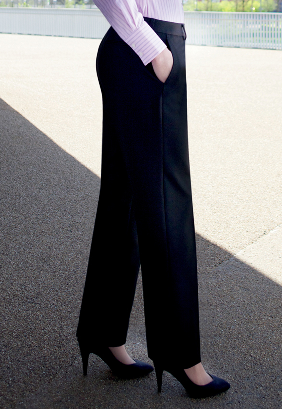 Straight leg, slim waistband, 2 side pockets, mock rear pockets, belt loops.