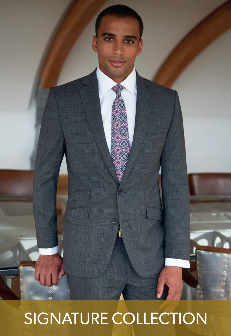 Single breasted slim fit jacket, shorter length, 2 button front, side vents, ticket pocket, slim lapels with saddle stitching, piano faced interior with slim pocket jets.