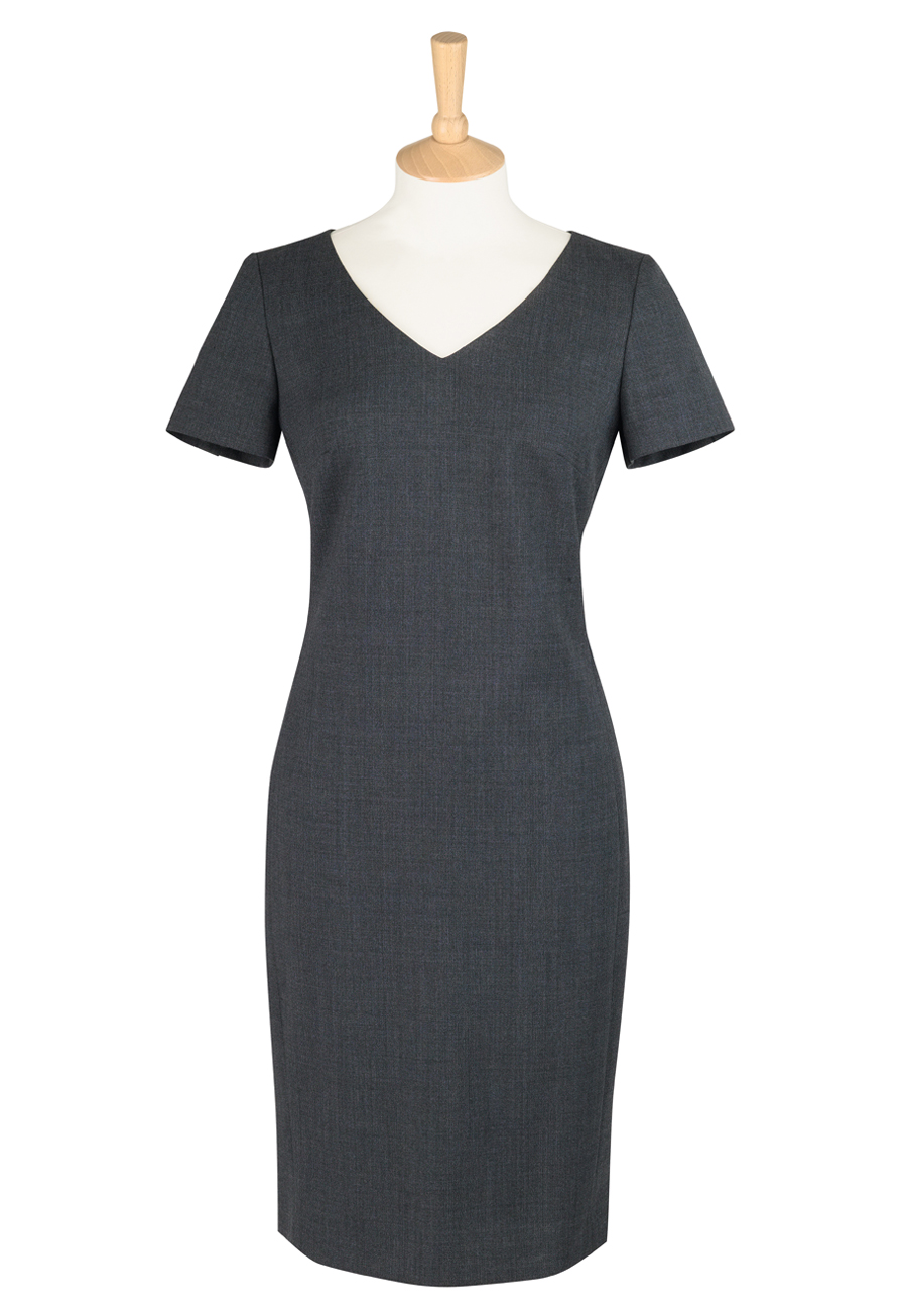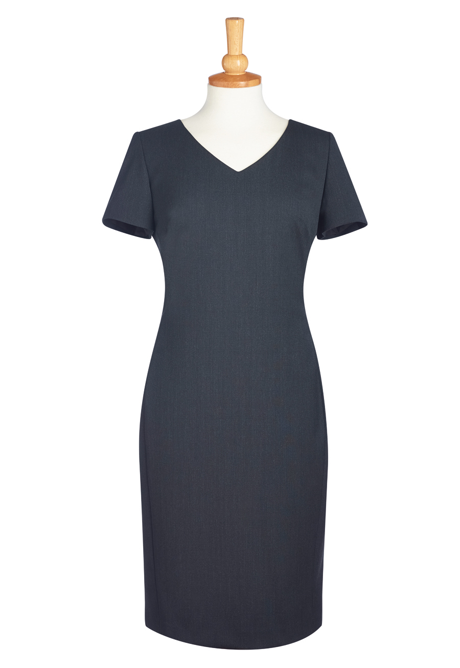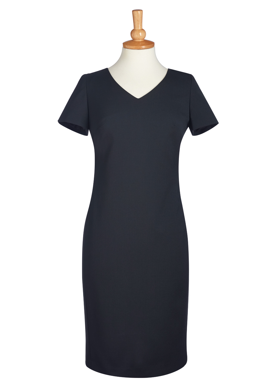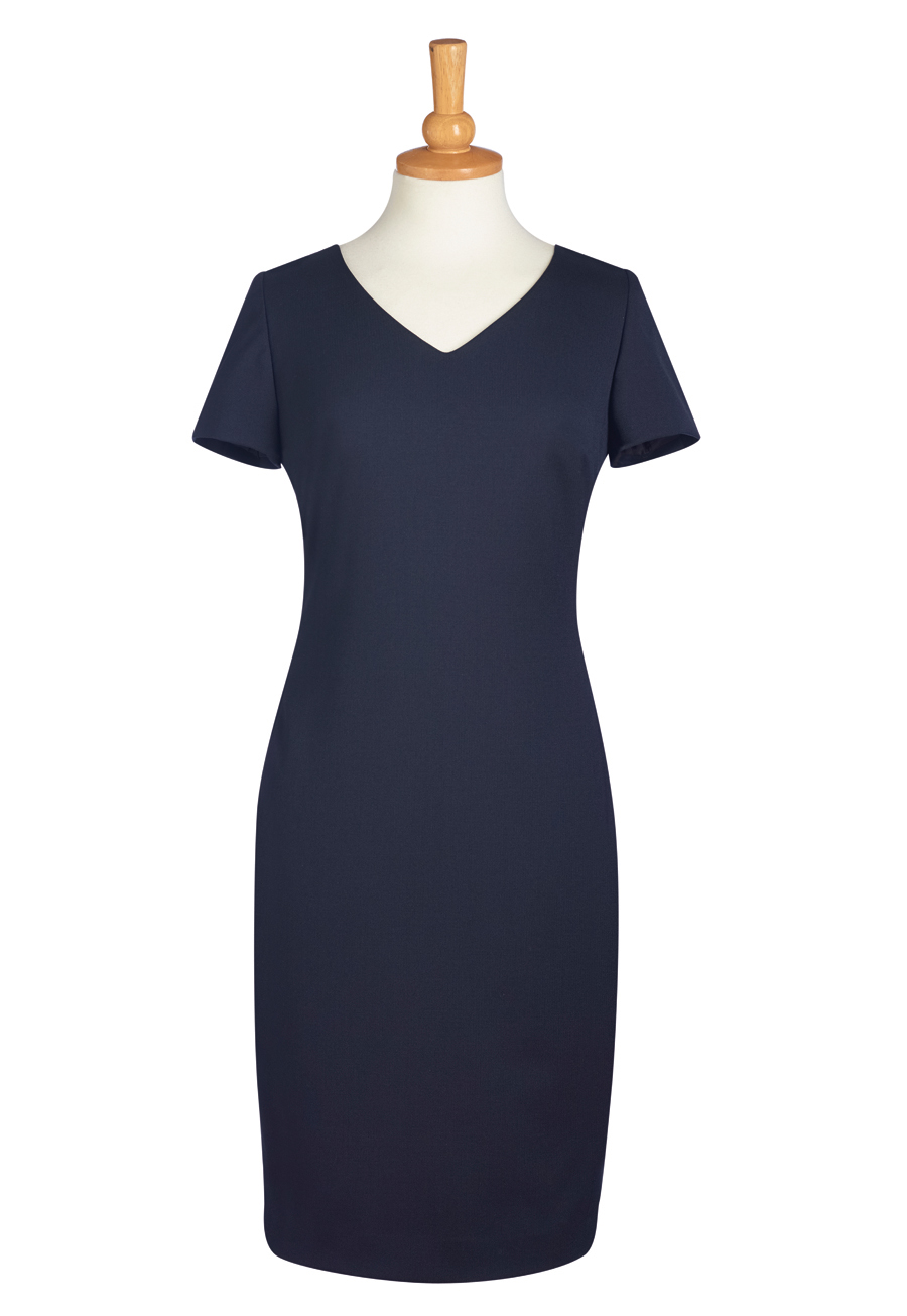 Beautifully tailored, versatile V-neck dress, short sleeves with vent detail, bust darts, centre vent, full stretch lining.