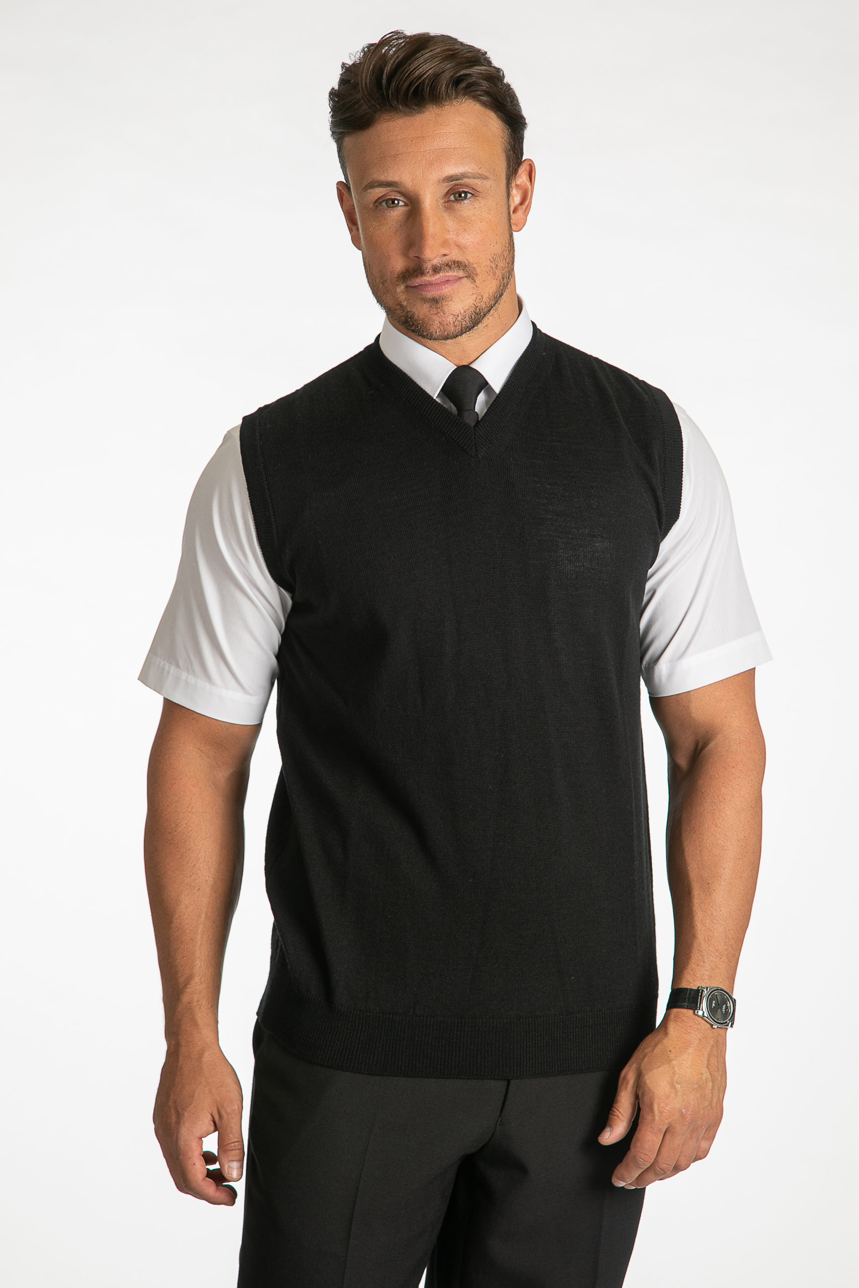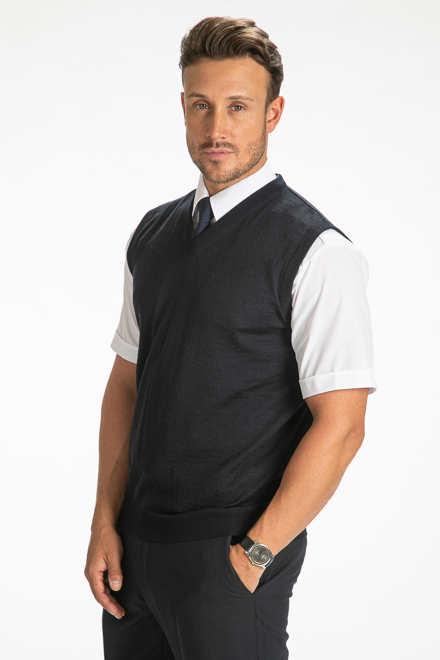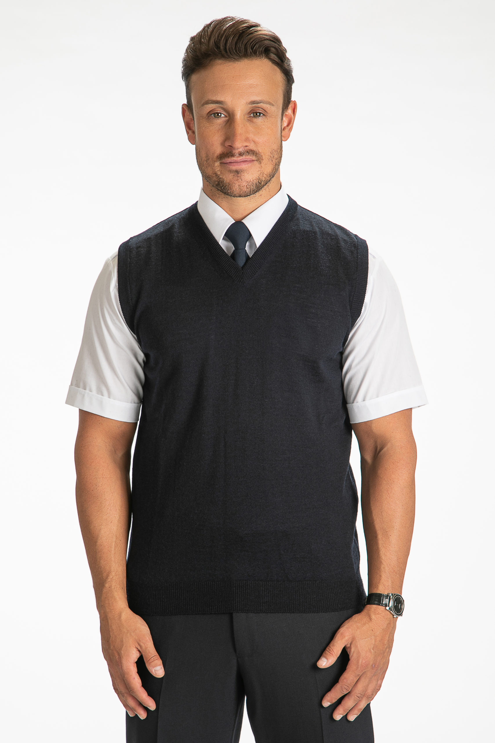 Fine gauge 100% merino wool , machine washable, These quality v-neck slipovers are extremly comfortable and give extra warmth without the bulk.