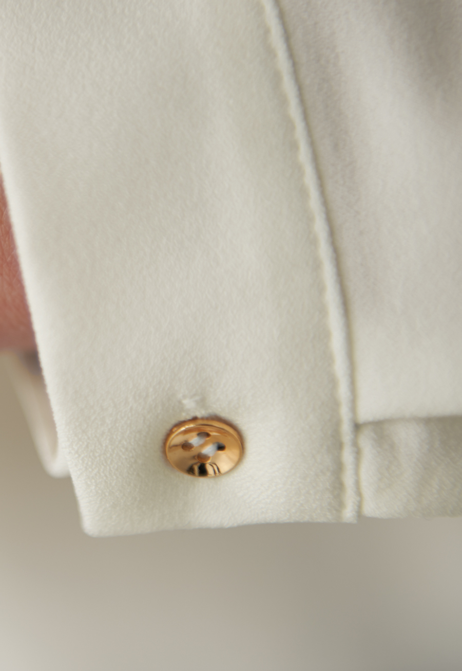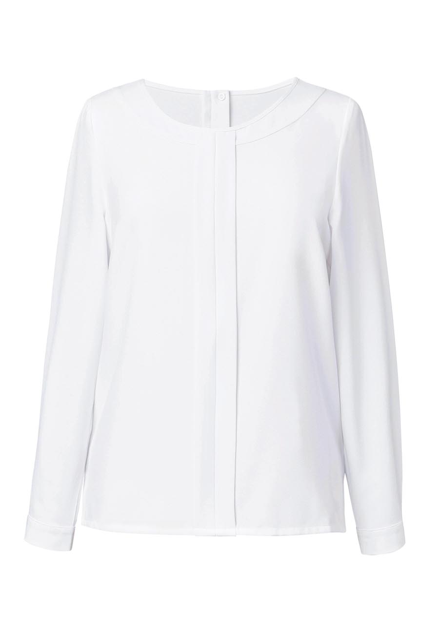 Long sleeve ladies’ blouse, round neck, front pleat detail, bust darts, single gold button cuff, rear gold zip detail, easy care – machine washable at 30 degrees