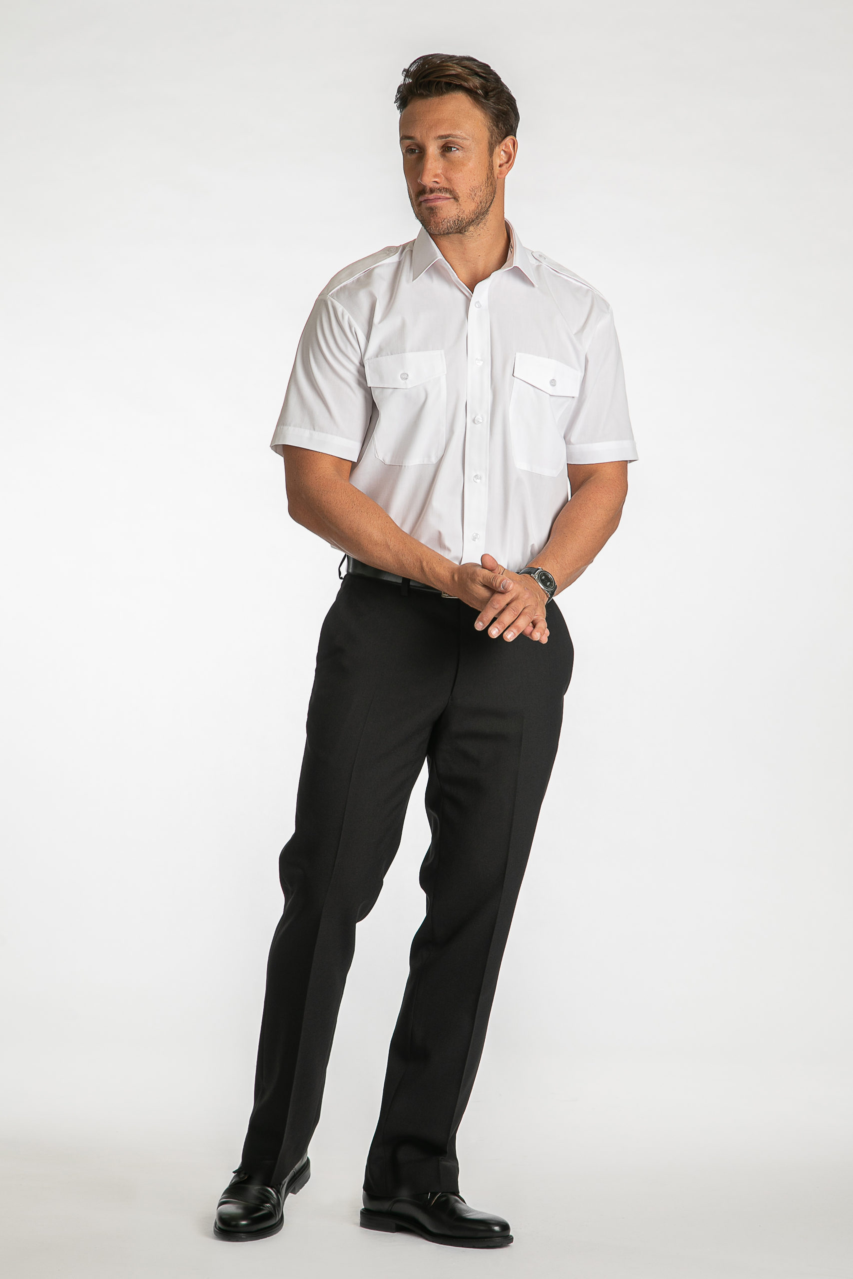 Our own brand of traditional styled pilot shirts with shoulder straps to take the epaulettes, two breast pockets, pen slot. Designed with a pleated back to allow ease of movement. Manufactured from easy care white poly/cotton.